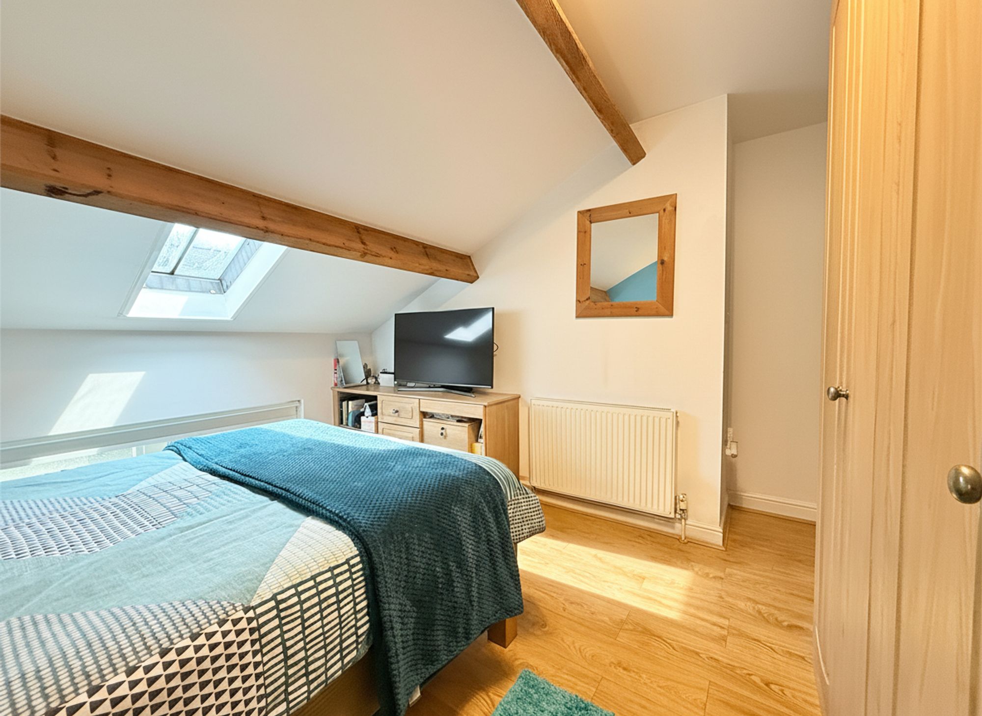 Located to the front of the property, this spacious principal bedroom is a standout feature, showcasing stunning exposed wooden beam detailing that adds character and charm. The room is flooded with natural light from a Velux window and additional window, creating a bright and airy feel. Decorated in bold tones and finished with wood-effect laminate flooring, the room offers both style and practicality. It benefits from a range of fitted wood-effect furniture, including floor-to-ceiling wardrobes, a vanity desk, and bedside tables, providing excellent storage solutions. The bedroom is further enhanced by a large additional storage cupboard built above the stair bulkhead, maximising the available space.