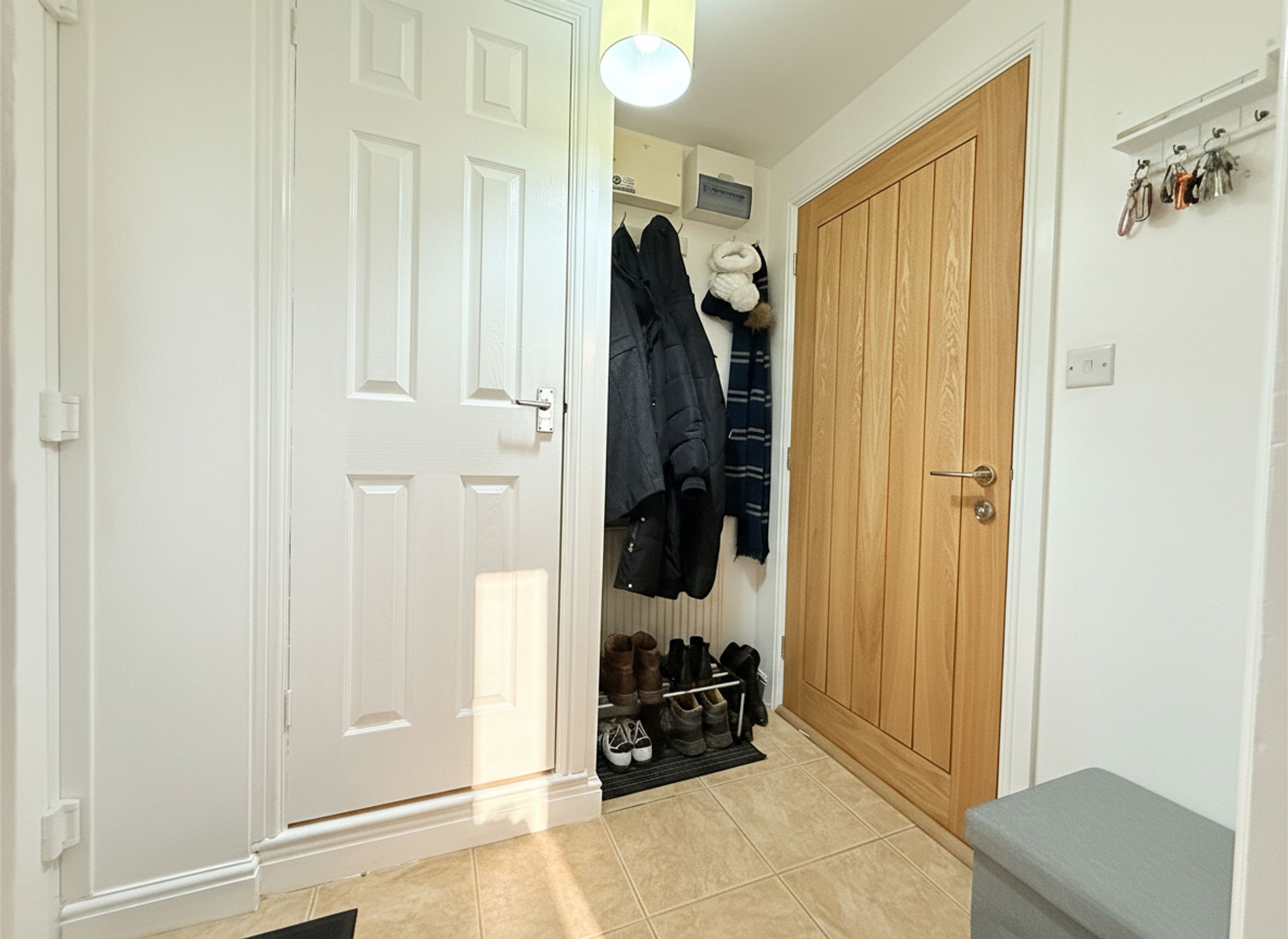 A spacious and welcoming entrance hall, neutrally decorated and finished with neutral tiled flooring. The area provides access to the living kitchen and WC and also benefits from a useful storage cupboard. There is ample space for shoe and coat storage, making it both practical and inviting.