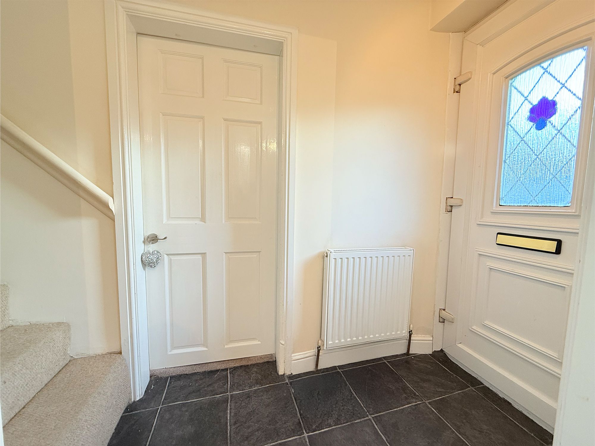 A welcoming entrance hall, neutrally decorated and finished with tile-effect linoleum flooring, creating a bright and practical first impression. The space provides access into the living room and dining kitchen with stairs rising to the first floor, offering a well-connected and functional layout.