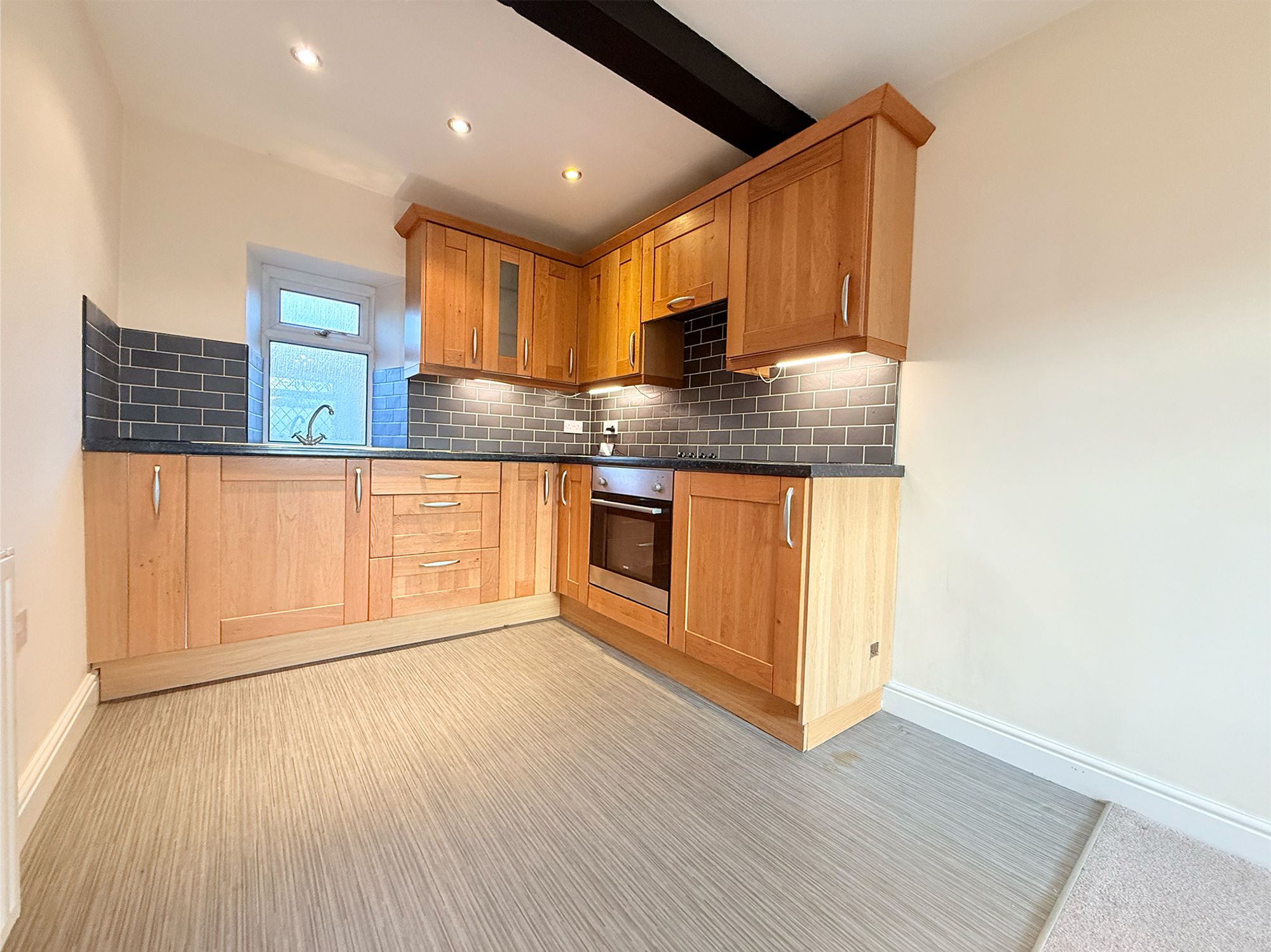 Spanning the full depth of the property, this spacious dining kitchen benefits from dual aspect windows that flood the room with natural light. The kitchen is fitted with wood-effect cabinetry, complemented by granite-effect worktops and black tiled splash-backs, creating a practical yet stylish workspace. Appliances include an electric oven, four-ring hob and a chrome sink with mixer tap, with ample space available for an American-style fridge freezer. The kitchen area is finished with wood-effect linoleum flooring, while the dining area is carpeted, offering a comfortable and defined space for a family dining suite. A built-in floor-to-ceiling storage cupboard adds valuable practicality, and original wooden beam details enhance the character of the room.